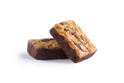 PEANUT BUTTER BROWNIE: Dairy free chocolate (organic evaporated cane juice, cocoa mass, cocoa butter, soy lecithin, ground vanilla beans), rice flour, evaporated cane juice, sunflower oil, natural peanut butter, organic powdered sugar, applesauce, cocoa, peanuts, flax seed, non-alum baking powder, sea salt, cocoa butter, natural flavours, baking soda, xanthan gum. CONTAINS: SOY, PEANUTS