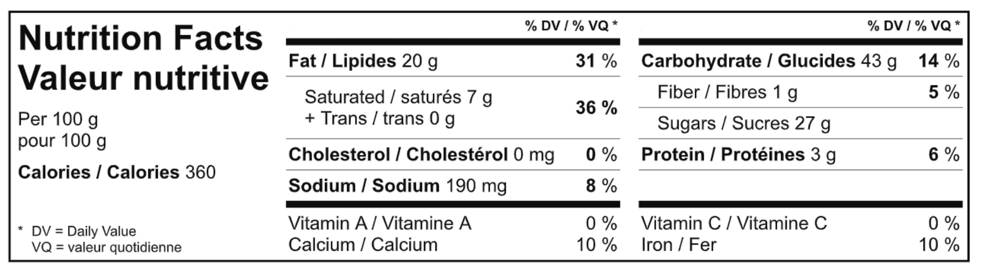 INGREDIENTS: Organic unbleached wheat flour, organic evaporated cane juice, organic soy milk, natural oil blend (organic sustainable palm fruit oil, sunflower, canola, flax, olive), organic coconut milk, organic icing sugar, organic tofu, desiccated coconut, tapioca syrup, non-alum baking powder, lemon juice, organic coconut oil, tapioca flour, organic rice milk, natural vanilla, brown rice syrup, grape juice, sea salt. CONTAINS: WHEAT, SOY